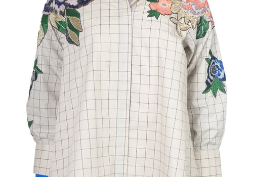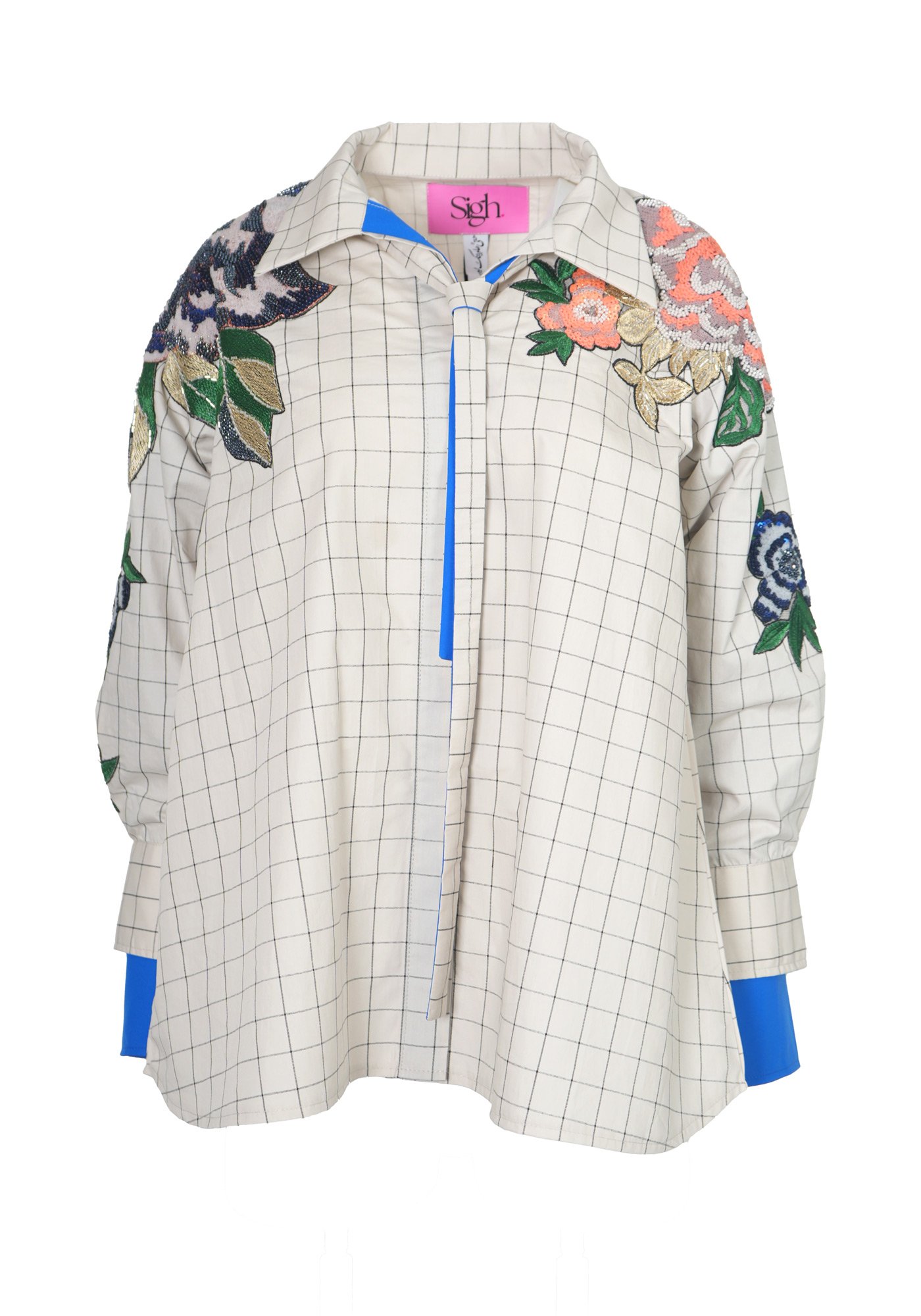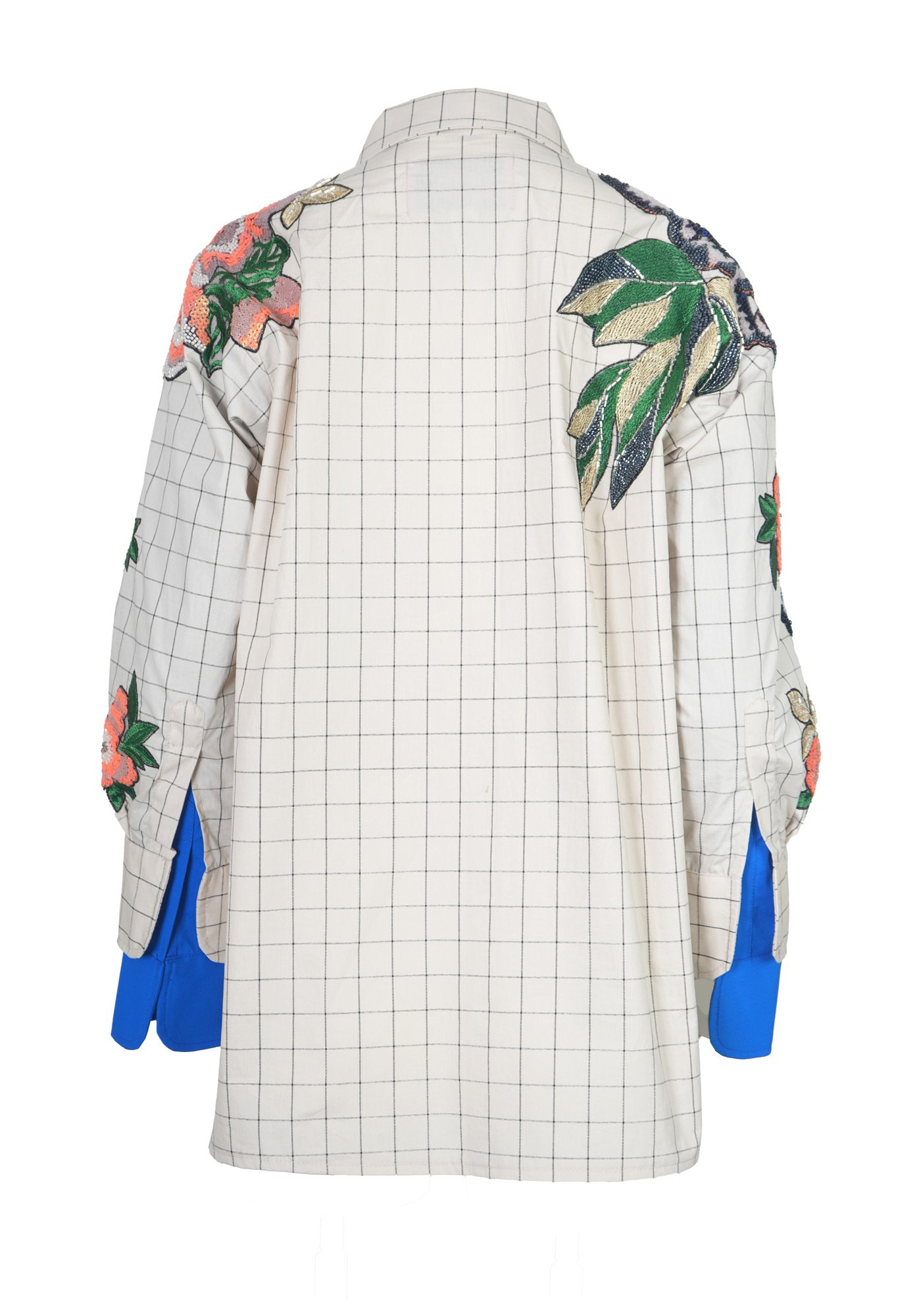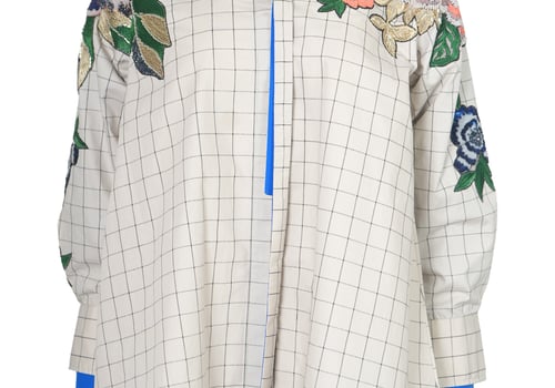 قميص مكون من القطن المشكوك بشك راقي مع حزام من فصل بلونين من القماش يمكن لبسه كحزام أو كرفته