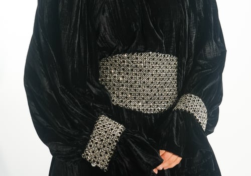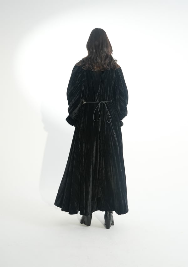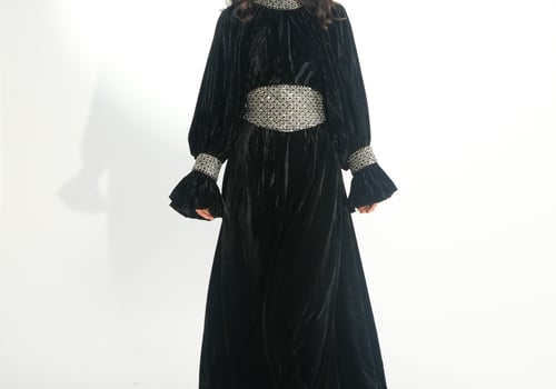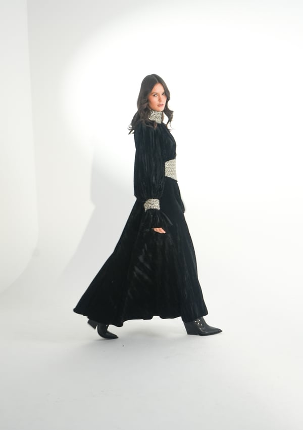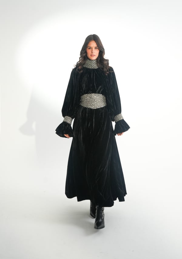 موديل رمضاني عباره فستان واسع من المخمل بقوله و أكمام مشكوكين و حزام مشكوك منفصل