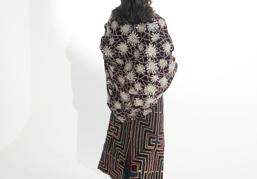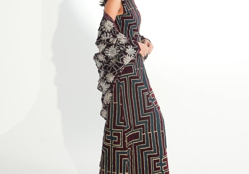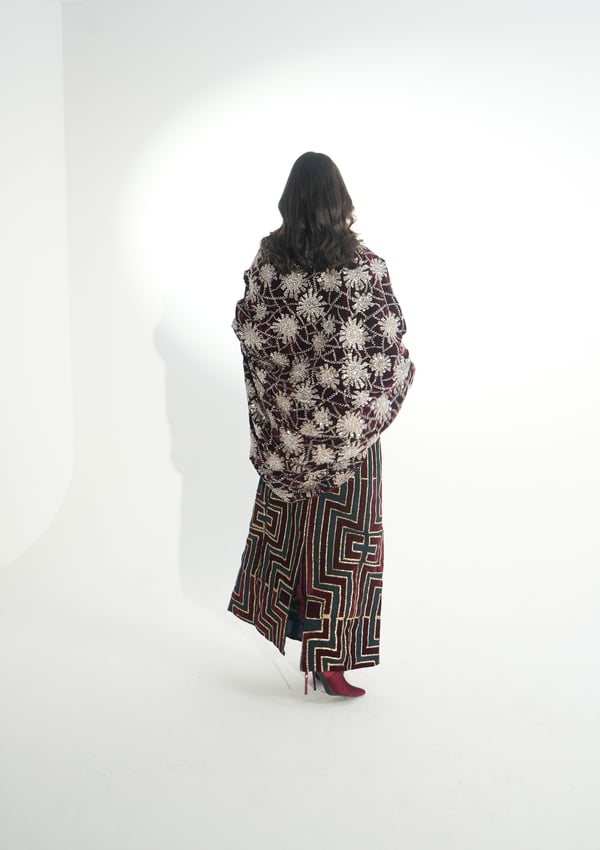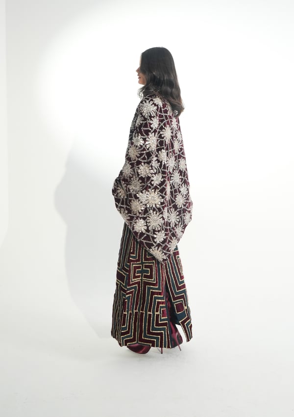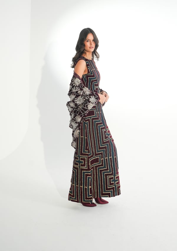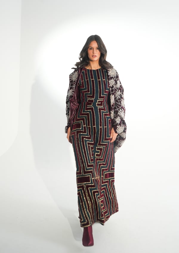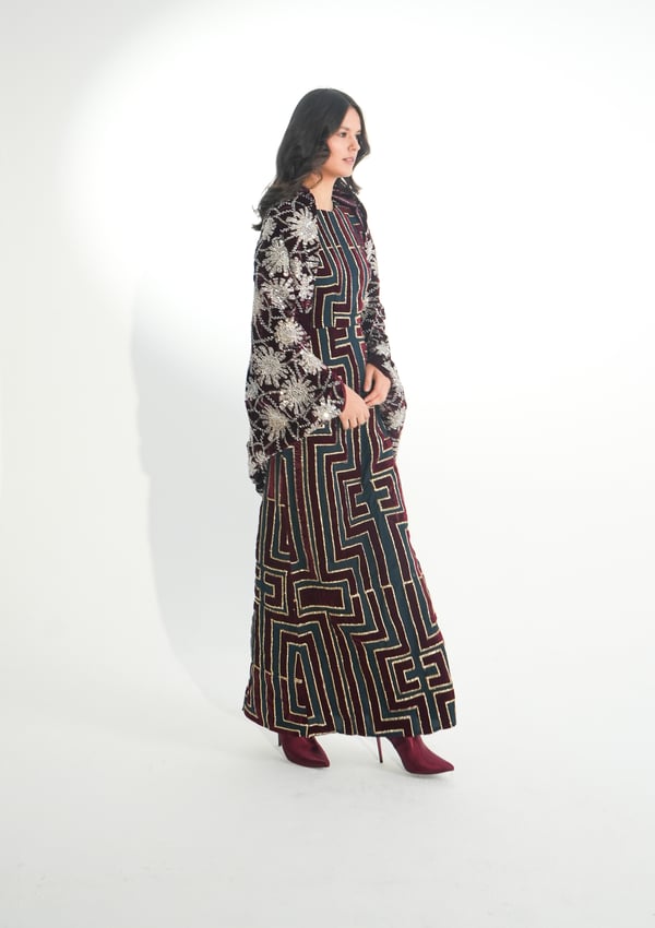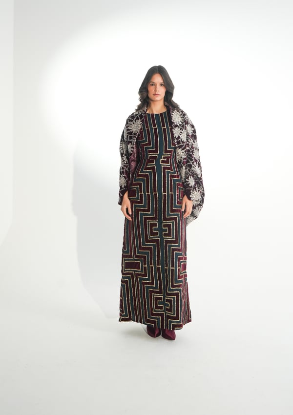 موديل رمضاني عباره فستان بدون أكمام مطرز بخيوط الآري و جاكين من المخمل المشكوك