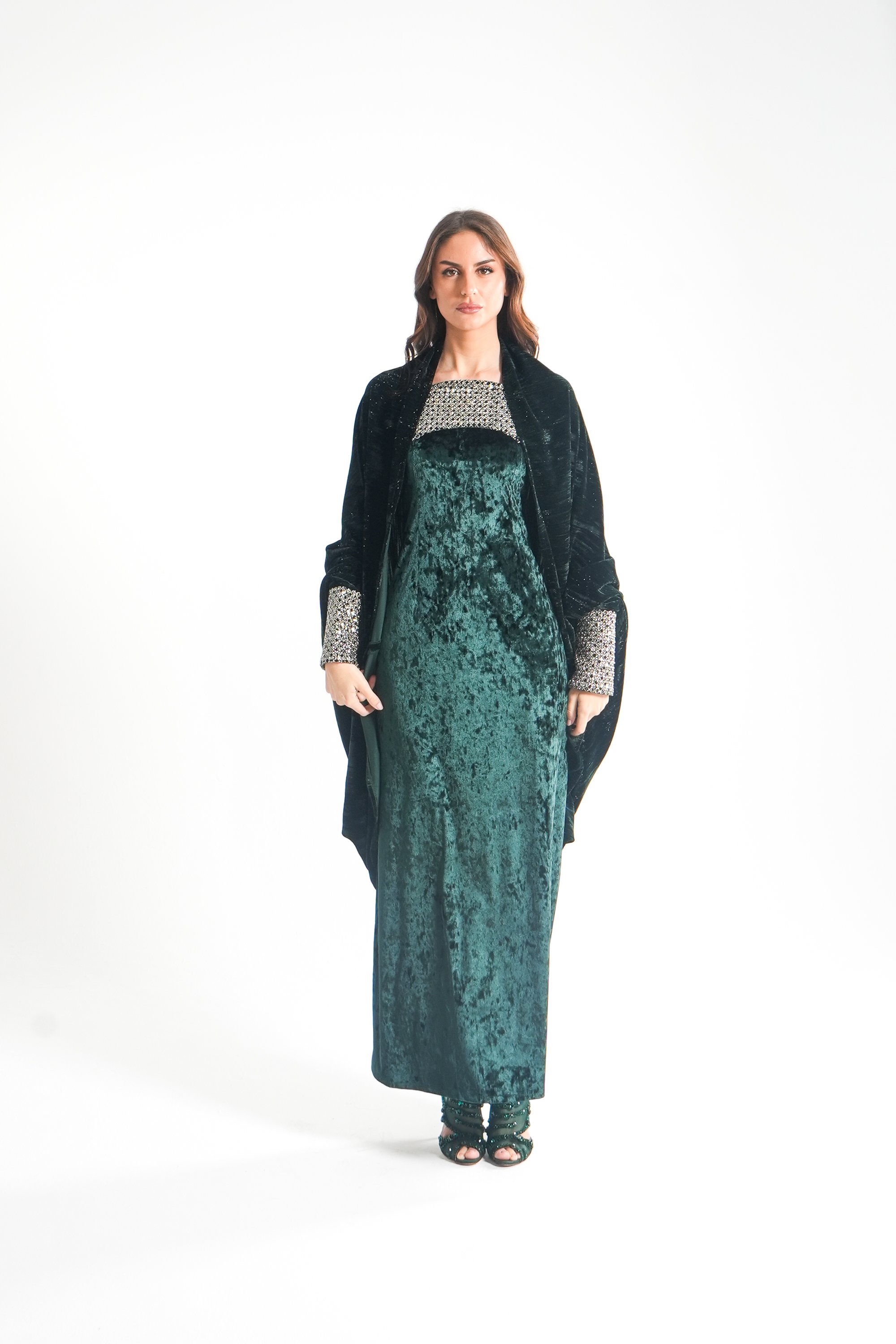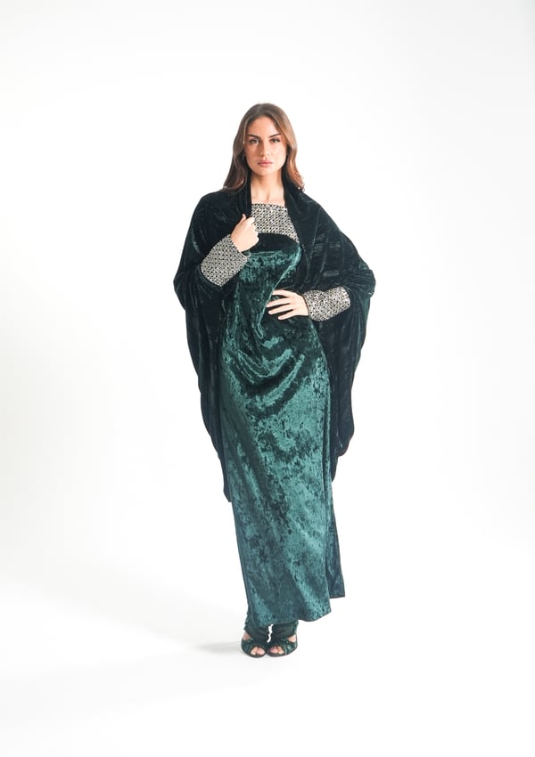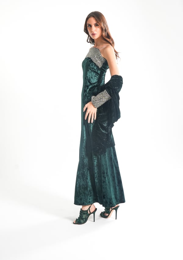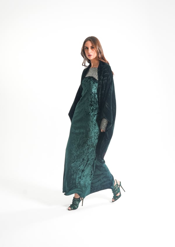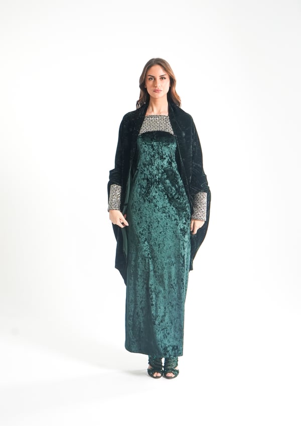 موديل رمضاني عباره فستان كوكتيل بدون أكمام بقصة صدر مشكوكه و  بحبل من الخلف للتخصير و جاكيت بأكمام مشكوكه
