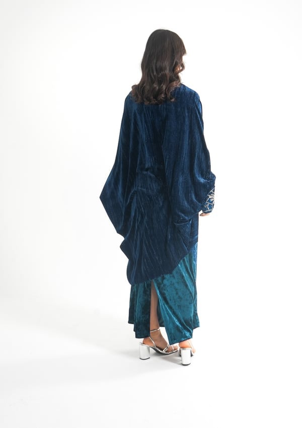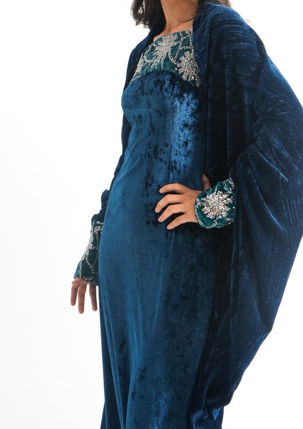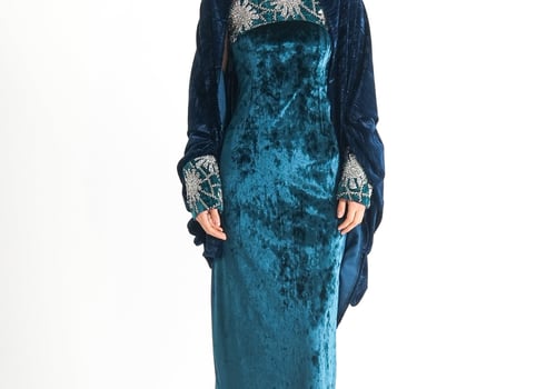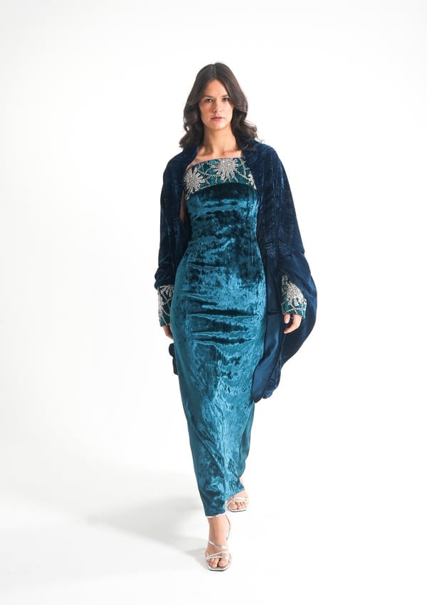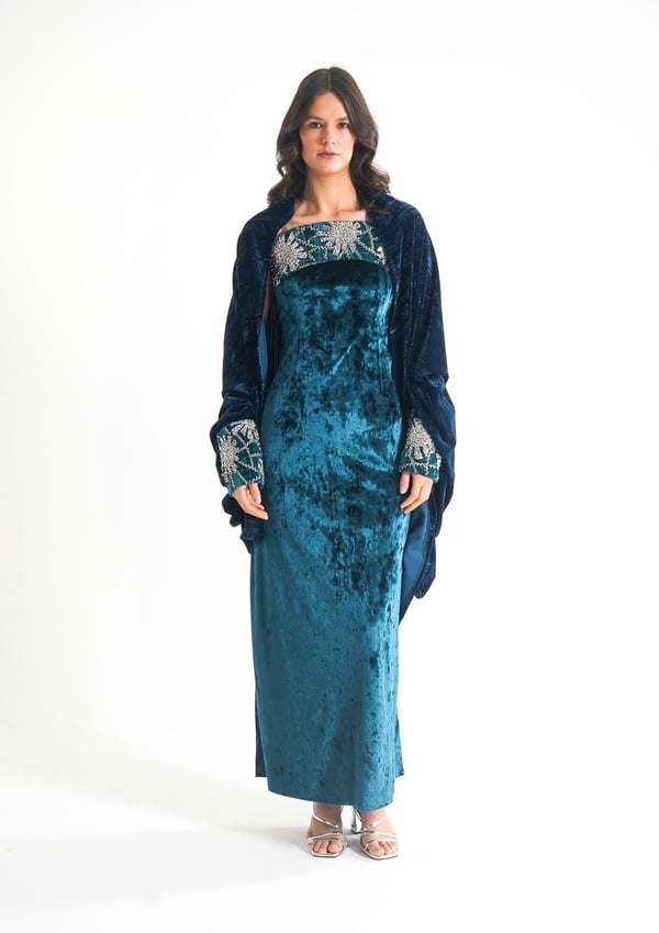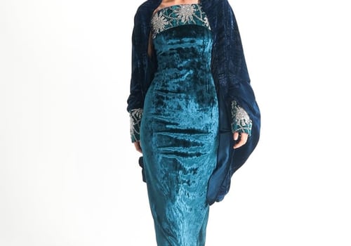 موديل رمضاني عباره فستان كوكتيل بدون أكمام بقصة صدر مشكوكه و  بحبل من الخلف للتخصير و جاكيت بأكمام مشكوكه