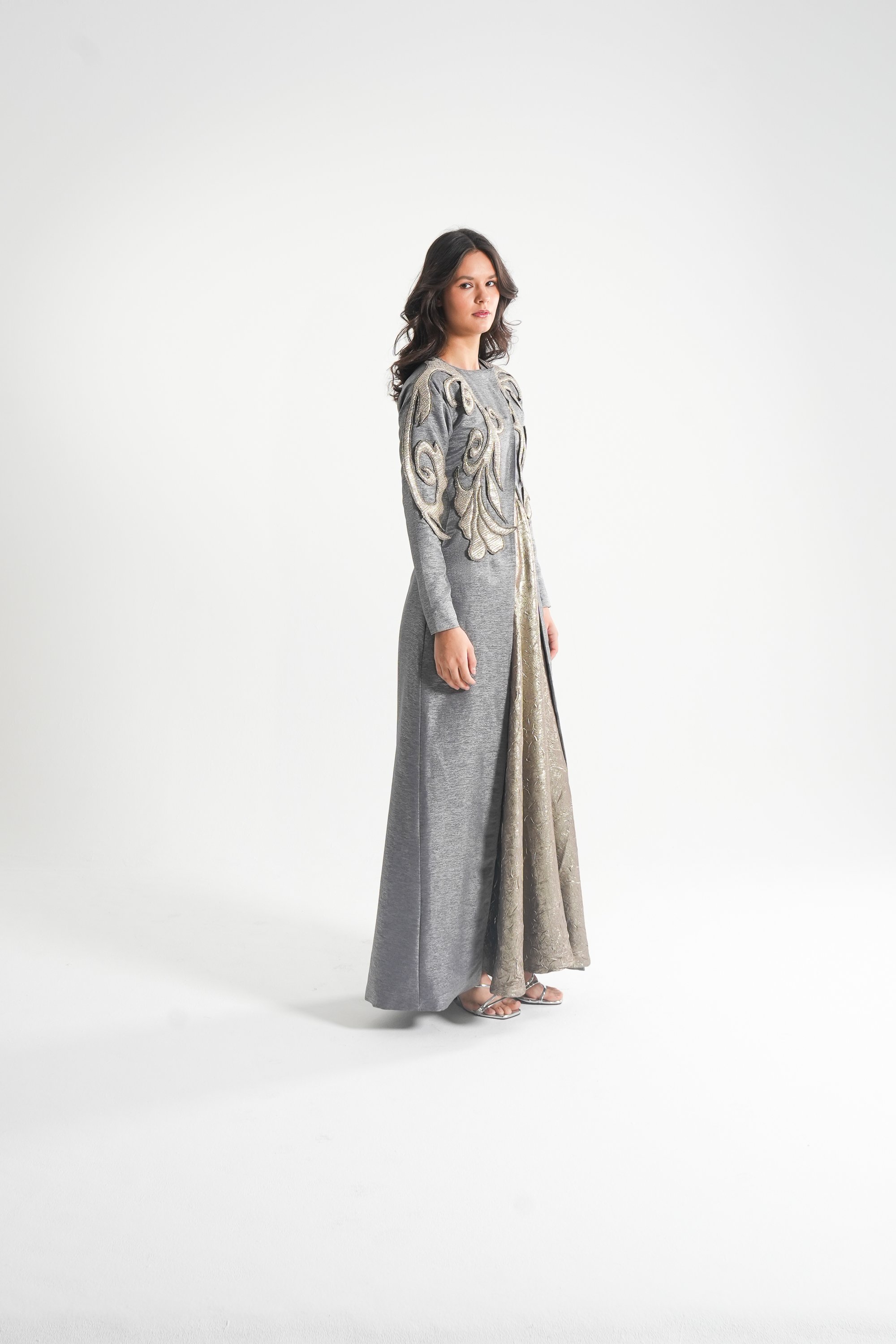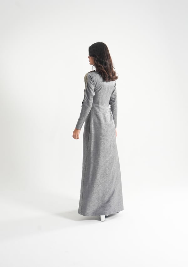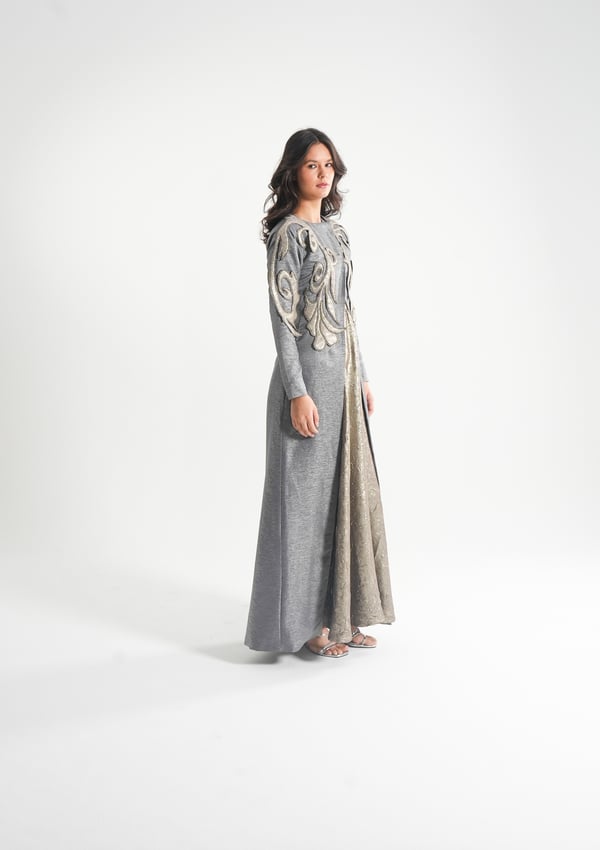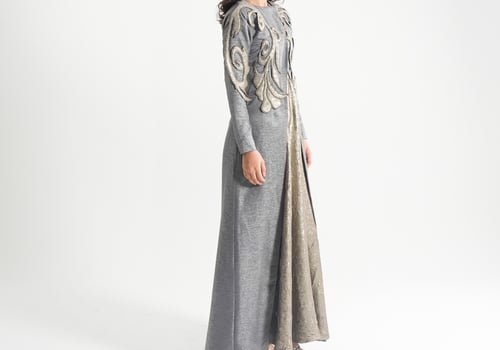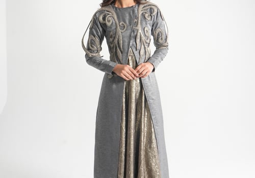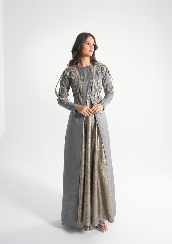موديل رمضاني عباره فستان حفر مع جاكيت بأكمام طويله و مطرز بتطريز ثلاثي الأبعاد ( القماش لنن فسكوس )
