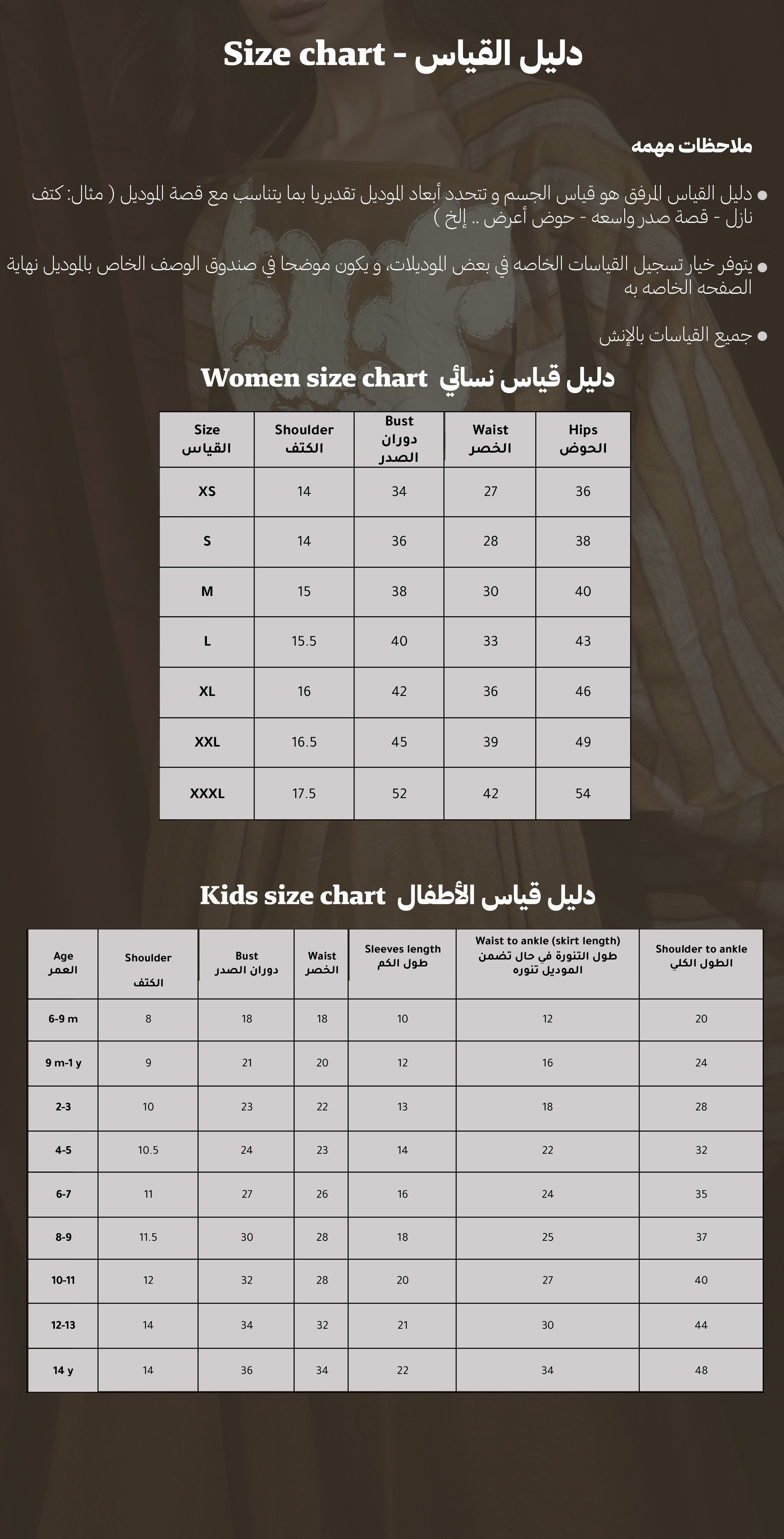 المعروضه في خانة القياسات، و بالامكان تسجيل قياسات خاصه في خانة الملاحظات أسفل خانة القياسات