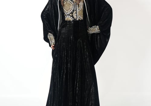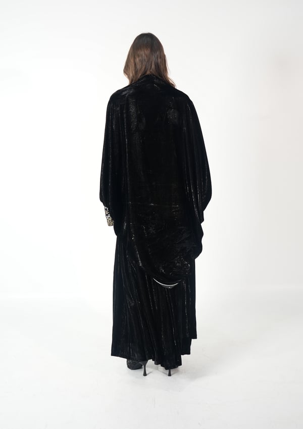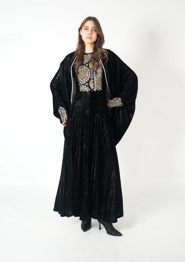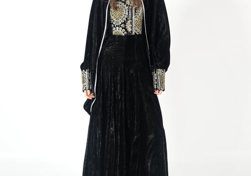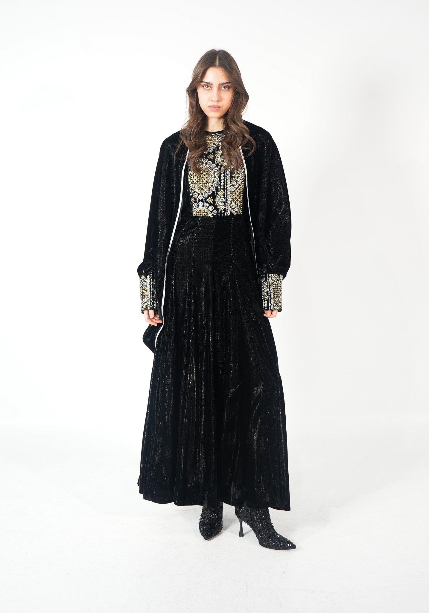 موديل رمضاني عباره فستان من قماش المخمل بخيوط من السلفر مشكوك من الصدر والأكمام