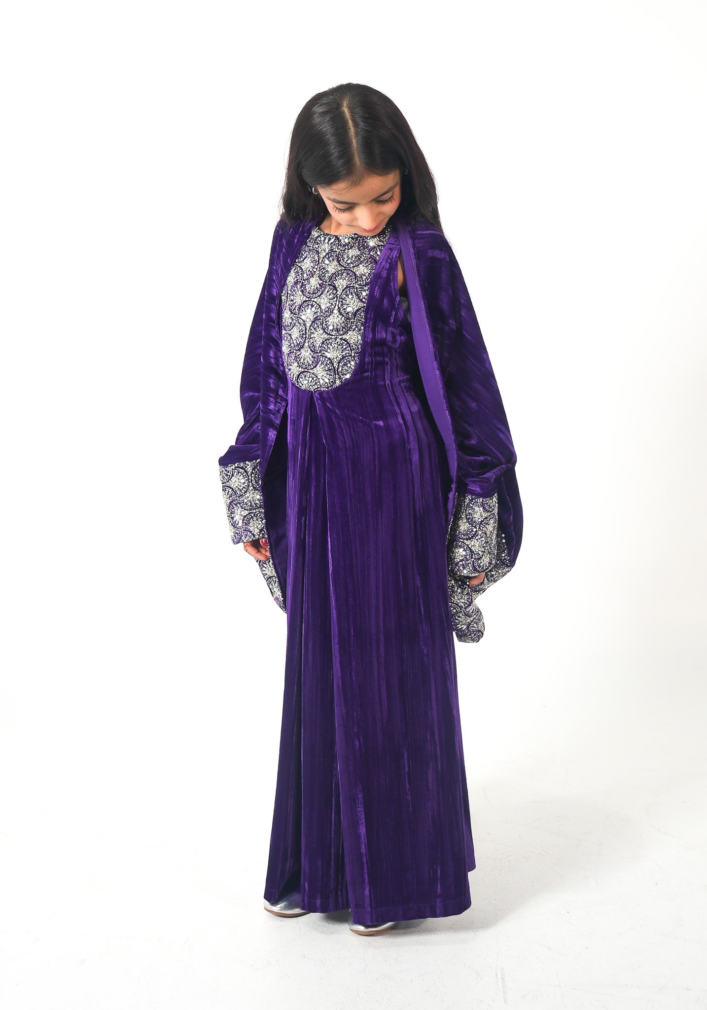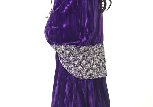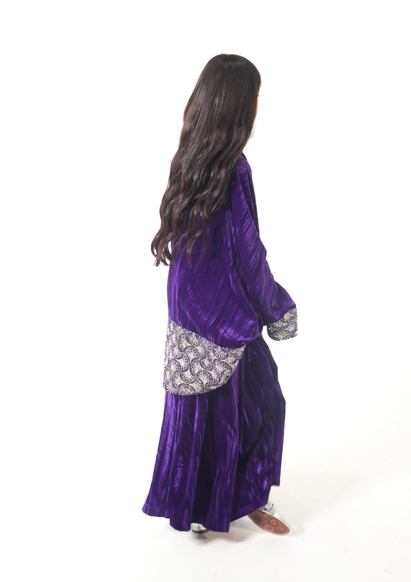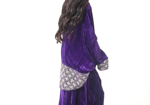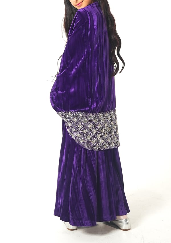 موديل رمضاني عباره فستان و جاكيت من قماش المخمل مشكوك من الصدر والأكمام